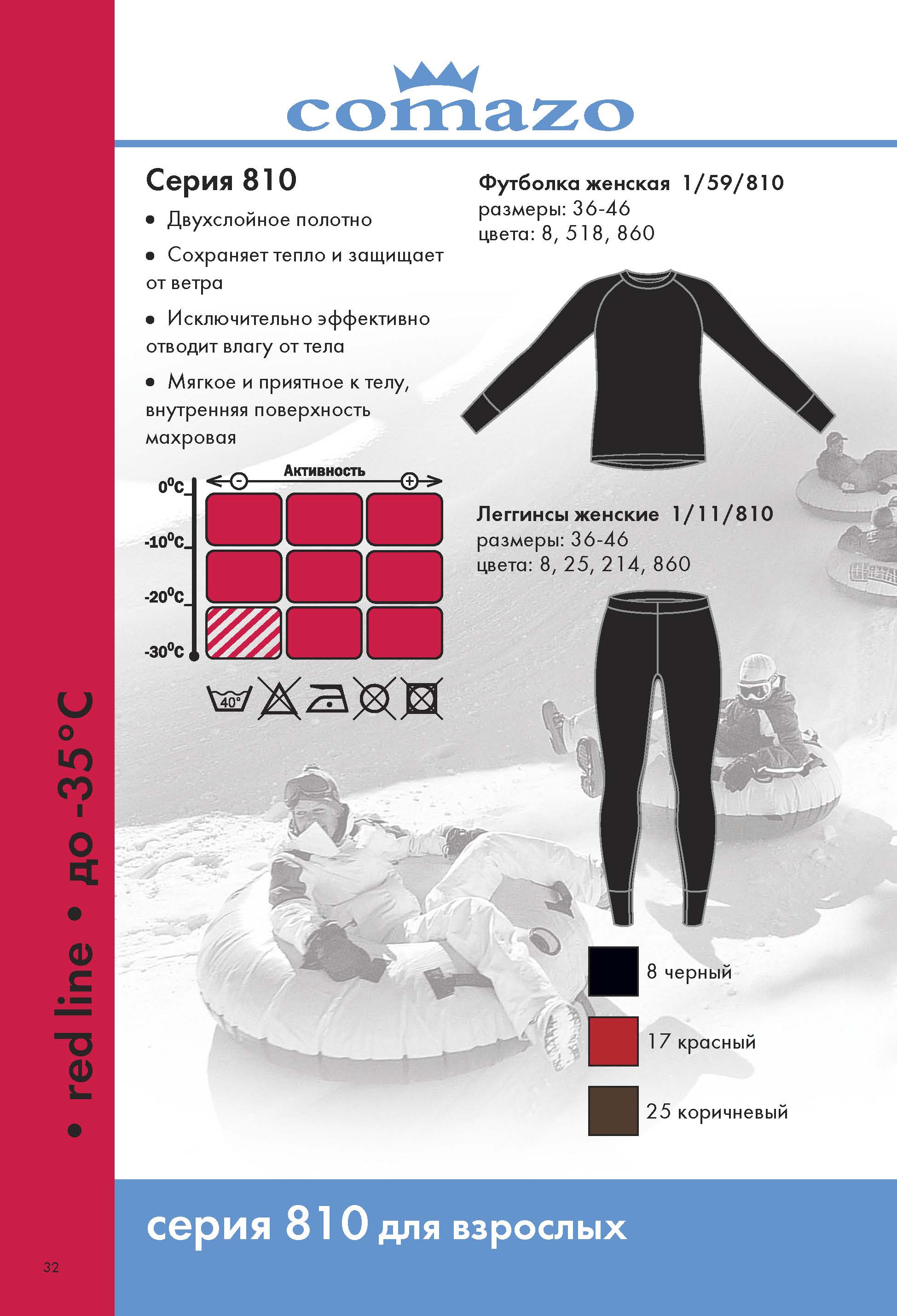 Женские термолеггинсы Comazo SPORT -35, артикул 1/11/810. Подходят для экстремально холодной погоды ниже -20°C. Состав: 40% полипропилен, 30% шерсть, 30% акрил. Двухслойное полотно с махровой внутренней поверхностью защищает от ветра и сохраняет тепло.
