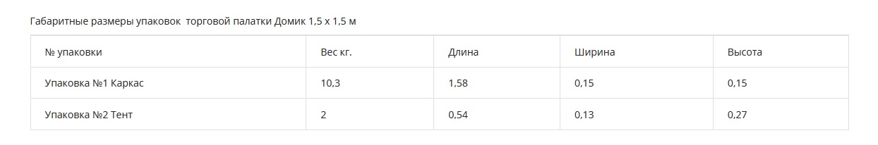 Торговая палатка Домик размером 1,5х1,5 м с каркасом из стальной трубы диаметром 18 мм, покрытой порошковой краской. Угловые соединения диаметром 22 мм. Быстрая сборка без болтового крепления. Влагостойкость тента 2000 мм водяного столба. 4 входа, наличие козырька для защиты от осадков. Размер основания палатки: 1,5 x 1,5 м. Высота боковой стенки: 1,85 м. Высота в коньке: 2,12 м. Вес 12,3 кг.